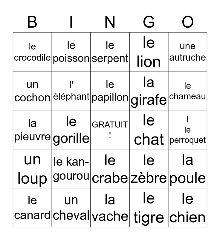This bingo card has a free space and 24 words: le kan-gourou, un cheval, le papillon, le canard, une autruche, le crocodile, un cochon, le poisson, le chat, le crabe, la girafe, la pieuvre, le zèbre, la poule, l' éléphant, le tigre, l le perroquet, le serpent, le chameau, le gorille, le chien, un loup, le lion and la vache.