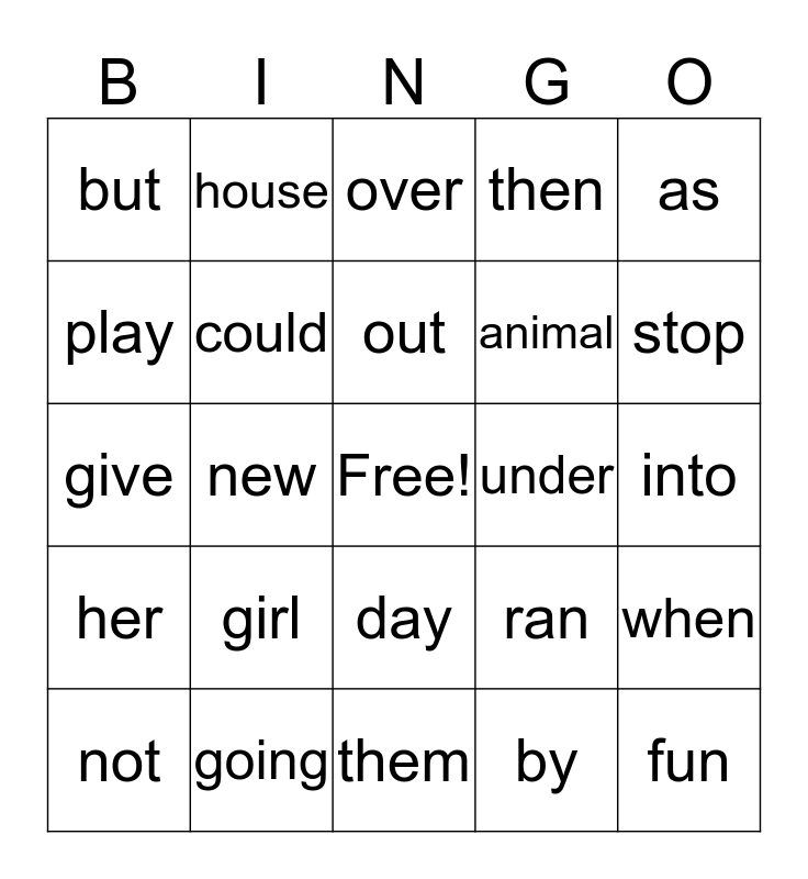 This bingo card has a free space and 24 words: girl, going, out, not, as, but, play, house, under, day, animal, give, ran, when, could, by, into, over, stop, new, fun, her, then and them.