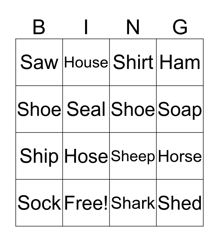 This bingo card has 16 words: Free!, Horse, Shirt, Saw, Ship, House, Sheep, Shark, Shoe, Seal, Sock, Ham, Hose, Soap, Shoe and Shed.
