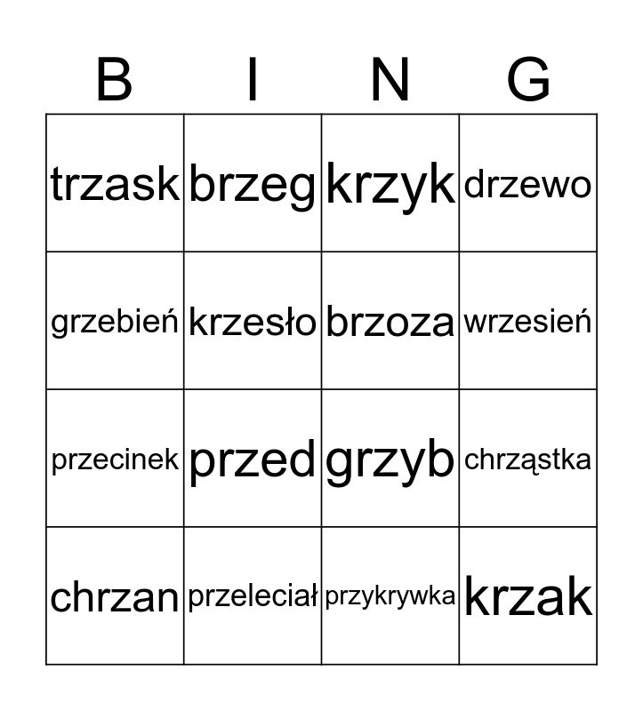 This bingo card has 16 words: przeleciał, chrząstka, krzyk, trzask, przecinek, brzeg, grzyb, przykrywka, grzebień, krzesło, chrzan, drzewo, przed, wrzesień, brzoza and krzak.