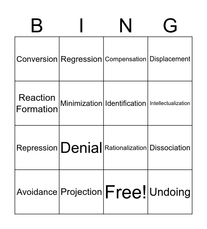 This bingo card has 17 words: Free!, Avoidance, Compensation, Conversion, Denial, Displacement, Dissociation, Identification, Intellectualization, Minimization, Projection, Rationalization, Reaction Formation, Regression, Repression, Sublimation and Undoing.