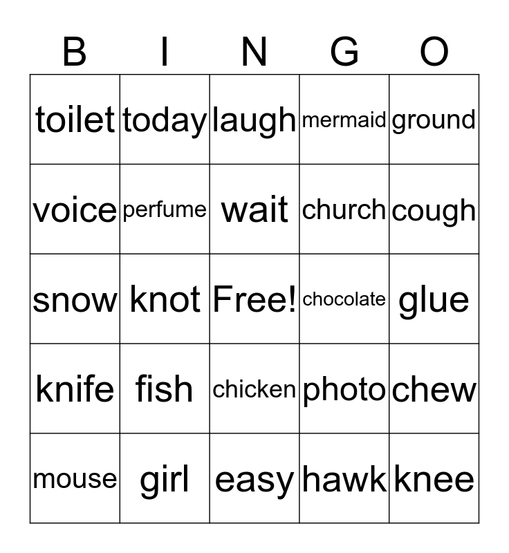 This bingo card has a free space and 24 words: fish, girl, wait, mouse, ground, toilet, voice, today, chocolate, chicken, church, snow, photo, chew, perfume, hawk, glue, laugh, cough, knot, knee, knife, mermaid and easy.