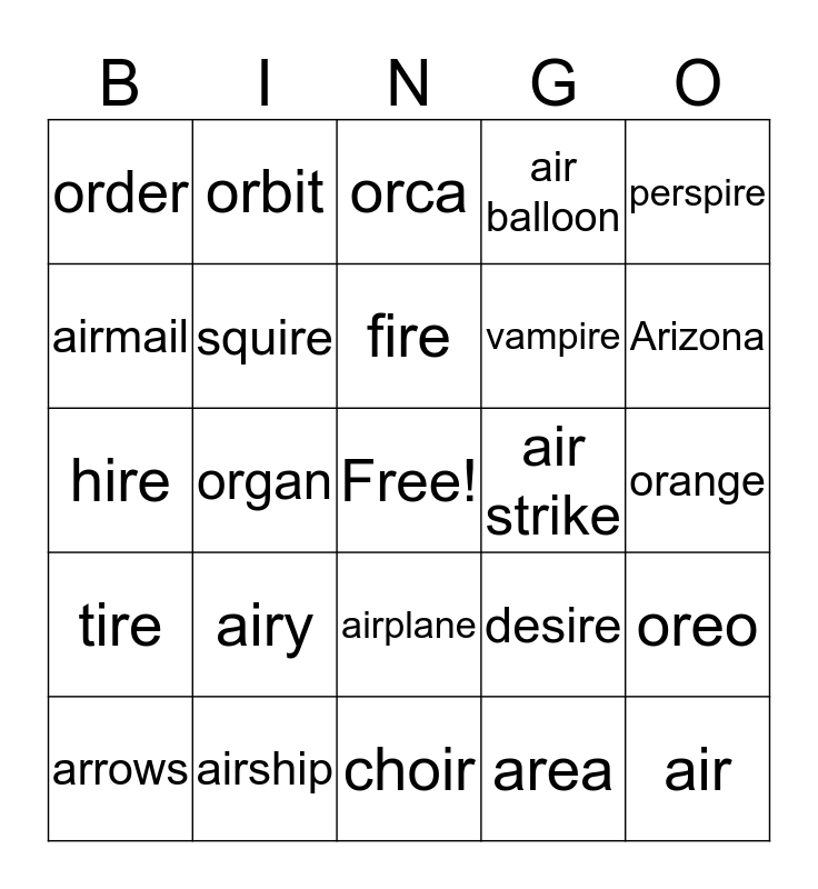 This bingo card has a free space and 24 words: airy, airship, fire, arrows, perspire, order, airmail, orbit, air strike, airplane, vampire, hire, desire, oreo, squire, area, orange, orca, Arizona, organ, air, tire, air balloon and choir.