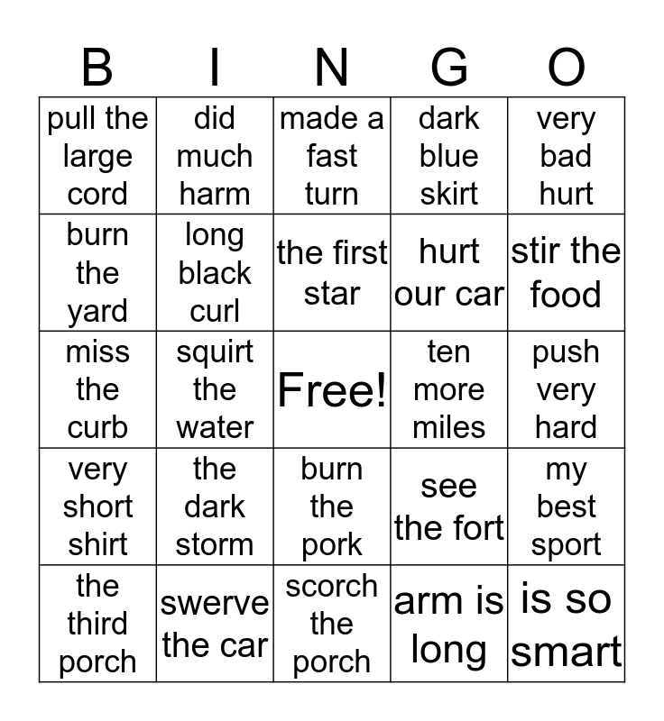 This bingo card has a free space and 24 words: the dark storm, swerve the car, the first star, the third porch, very bad hurt, pull the large cord, burn the yard, did much harm, ten more miles, burn the pork, hurt our car, miss the curb, see the fort, my best sport, long black curl, arm is long, push very hard, made a fast turn, stir the food, squirt the water, is so smart, very short shirt, dark blue skirt and scorch the porch.