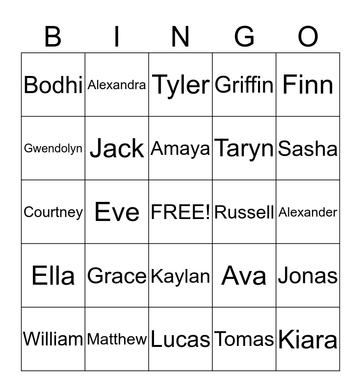 This bingo card has a free space and 24 words: Grace, Matthew, Amaya, William, Finn, Bodhi, Gwendolyn, Alexandra, Russell, Kaylan, Taryn, Courtney, Ava, Jonas, Jack, Tomas, Alexander, Tyler, Sasha, Eve, Kiara, Ella, Griffin and Lucas.