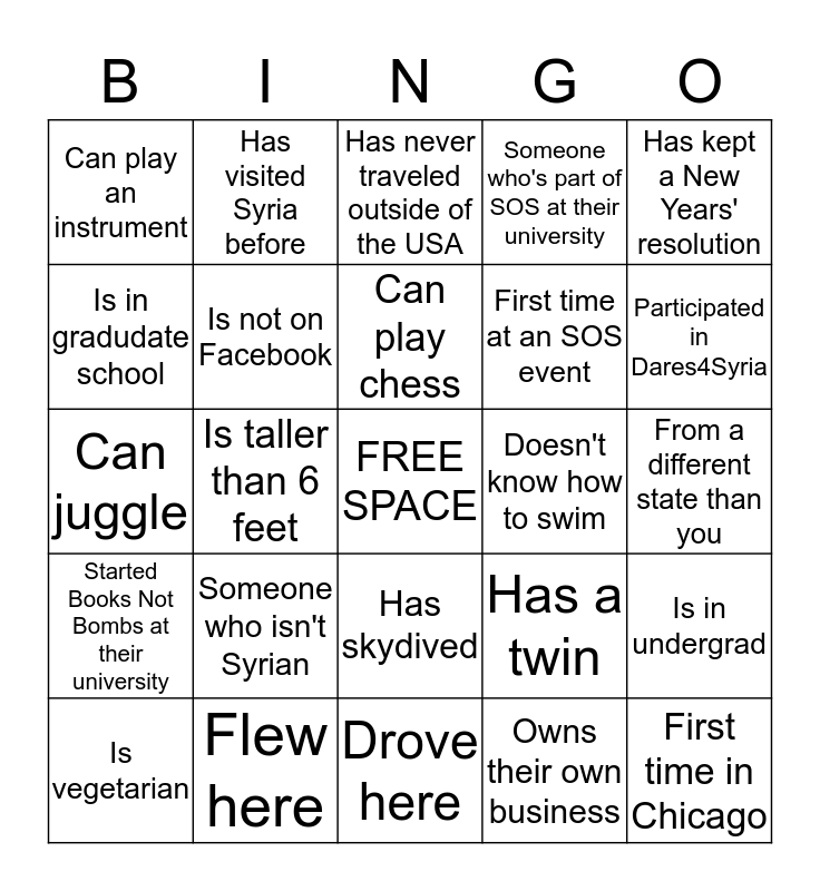 This bingo card has a free space and 24 words: Someone who isn't Syrian, Flew here, Can play chess, Is vegetarian, Has kept a New Years' resolution, Can play an instrument, Is in gradudate school, Has visited Syria before, Doesn't know how to swim, Has skydived, First time at an SOS event, Can juggle, Has a twin, Is in undergrad, Is not on Facebook, Owns their own business, From a different state than you, Has never traveled outside of the USA, Participated in Dares4Syria, Is taller than 6 feet, First time in Chicago, Started Books Not Bombs at their university, Someone who's part of SOS at their university and Drove here.