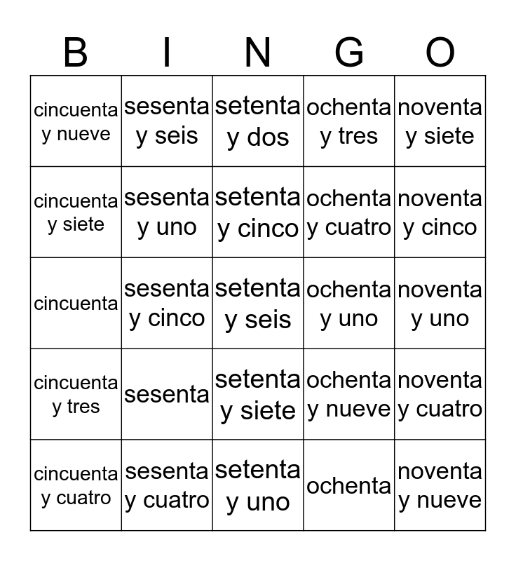 This bingo card has a free space and 24 words: cincuenta y cuatro, sesenta, setenta y cinco, ochenta, noventa y siete, cincuenta y nueve, sesenta y seis, setenta y dos, ochenta y uno, noventa y uno, cincuenta, sesenta y uno, ochenta y nueve, noventa y cuatro, cincuenta y siete, sesenta y cuatro, setenta y uno, ochenta y tres, noventa y cinco, cincuenta y tres, sesenta y cinco, setenta y siete, ochenta y cuatro and noventa y nueve.