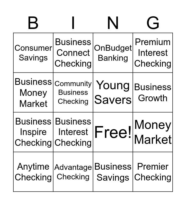 This bingo card has 19 words: Free!, Anytime Interest Checking, OnBudget Banking, Premier Checking, Money Market, Business Money Market, Business Savings, Consumer Savings, Business Connect Checking, Business Inspire Checking, Business Interest Checking, Community Business Checking, Young Savers, Advantage Checking, Anytime Checking, Business Money Market Sweep, Premium Interest Checking, Business Growth and Free!.