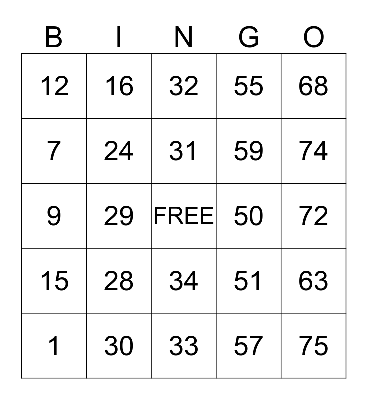 This bingo card has a free space and 24 words: 1, 28, 31, 57, 68, 12, 16, 32, 50, 72, 9, 24, 51, 63, 7, 30, 33, 55, 74, 15, 29, 34, 59 and 75.