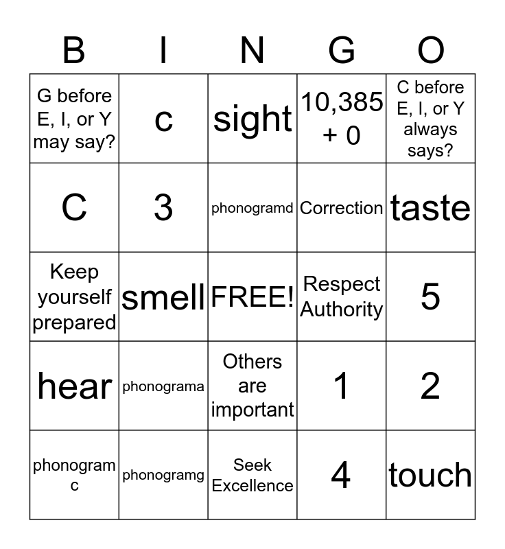 This bingo card has a free space and 24 words: phonograma, phonogramg, phonogramd, phonogram c, C before E, I, or Y always says?, G before E, I, or Y may say?, C, c, Respect Authority, Others are important, Correction, Keep yourself prepared, 1, 2, 3, 4, 5, sight, taste, smell, touch, hear, 10,385 + 0 and Seek Excellence.