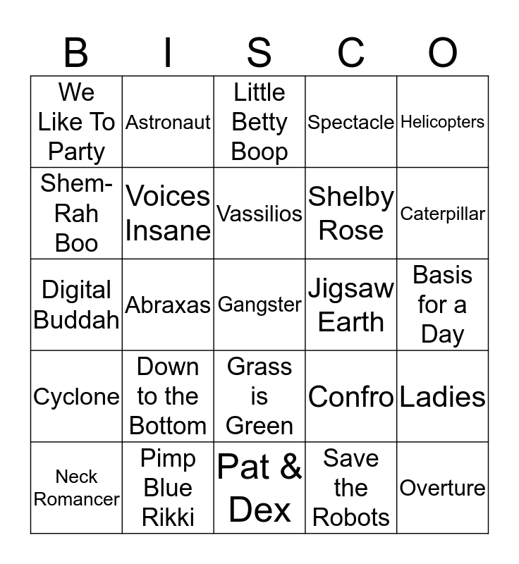 This bingo card has 25 words: Down to the Bottom, Pat & Dex, Vassilios, Neck Romancer, Helicopters, We Like To Party, Shem-Rah Boo, Astronaut, Jigsaw Earth, Grass is Green, Shelby Rose, Digital Buddah, Confro, Ladies, Voices Insane, Overture, Basis for a Day, Little Betty Boop, Caterpillar, Abraxas, Gangster, Pimp Blue Rikki, Cyclone, Spectacle and Save the Robots.