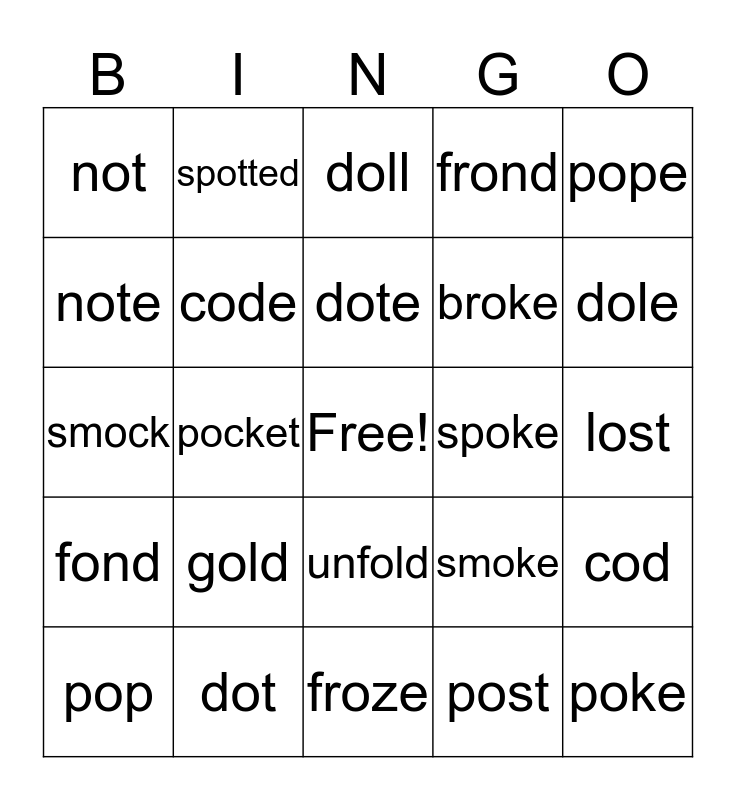 This bingo card has a free space and 24 words: gold, dot, dote, pop, pope, not, note, spotted, spoke, unfold, broke, smock, smoke, cod, code, post, lost, doll, dole, pocket, poke, fond, frond and froze.