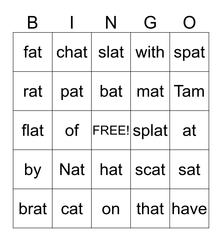 This bingo card has a free space and 24 words: Nat, cat, bat, brat, spat, fat, rat, chat, splat, hat, mat, flat, scat, sat, pat, that, at, slat, Tam, of, have, by, with and on.