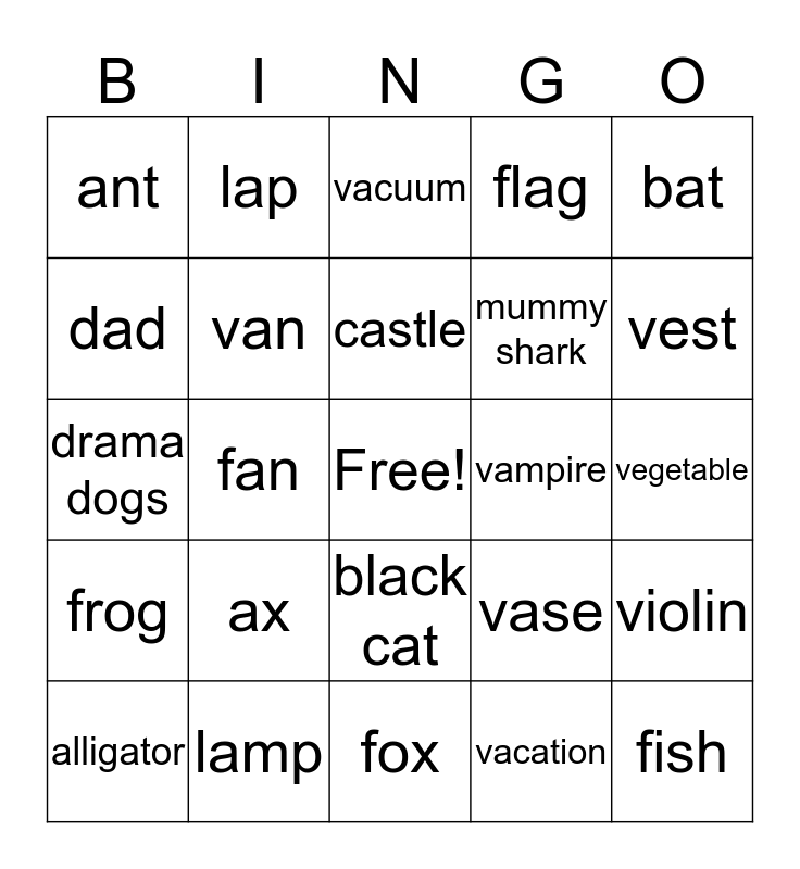 This bingo card has a free space and 24 words: ax, lamp, castle, alligator, bat, ant, dad, lap, vampire, black cat, mummy shark, drama dogs, vase, violin, van, vacation, vegetable, vacuum, vest, fan, fish, frog, flag and fox.