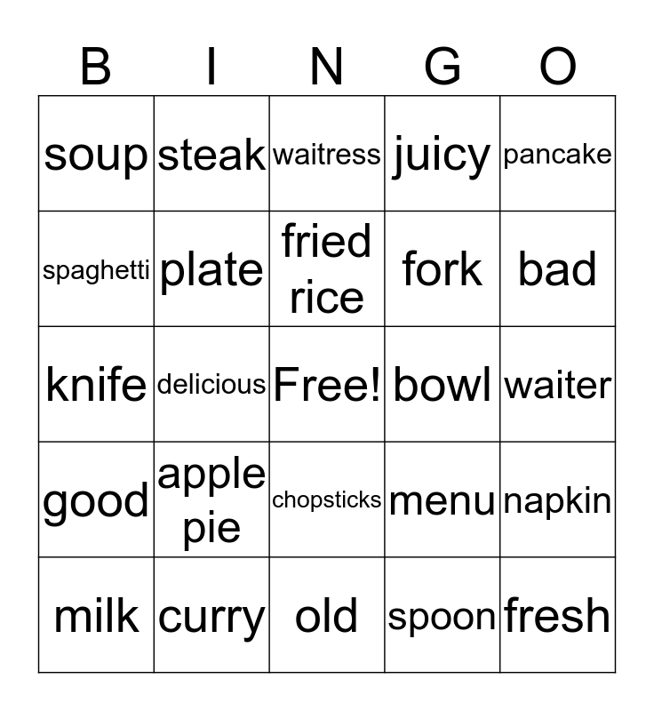 This bingo card has a free space and 24 words: apple pie, curry, fried rice, milk, pancake, soup, spaghetti, steak, bowl, chopsticks, fork, knife, menu, napkin, plate, spoon, waiter, waitress, bad, delicious, fresh, good, juicy and old.