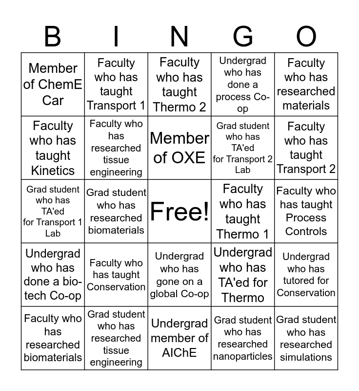 This bingo card has a free space and 25 words: Faculty who has taught Conservation, Undergrad member of AIChE, Member of OXE, Faculty who has researched biomaterials, Faculty who has researched materials, Member of ChemE Car, Faculty who has taught Kinetics, Faculty who has taught Transport 1, Faculty who has taught Thermo 1, Undergrad who has gone on a global Co-op, Grad student who has TA'ed for Transport 2 Lab, Grad student who has TA'ed for Transport 1 Lab, Undergrad who has TA'ed for Thermo, Undergrad who has tutored for Conservation, Faculty who has researched tissue engineering, Faculty who has researched STEM, Faculty who has taught Process Controls, Faculty who has taught Thermo 2, Faculty who has taught Transport 2, Grad student who has researched biomaterials, Grad student who has researched simulations, Grad student who has researched tissue engineering, Undergrad who has done a bio-tech Co-op, Undergrad who has done a process Co-op and Grad student who has researched nanoparticles.