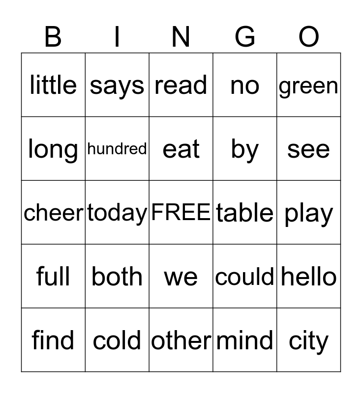 This bingo card has a free space and 24 words: both, cold, eat, find, green, little, long, says, table, we, by, cheer, could, hello, hundred, mind, play, read, see, today, city, full, no and other.