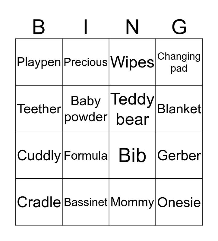 This bingo card has 35 words: Free!, Blankie, High chair, Teddy bear, Rubber duck, Changing pad, Baby powder, Baby swing, Blanket, Diaper, Bib, Teether, Bottle, Stroller, Playpen, Bassinet, Baby socks, Gerber, Onesie, Cradle, Burp cloth, Pacifier, Mittens, Booties, Wipes, Formula, Rattle, Lullaby, Cuddly, Mommy, Daddy, Nursery, Toys, Precious and Newborn.