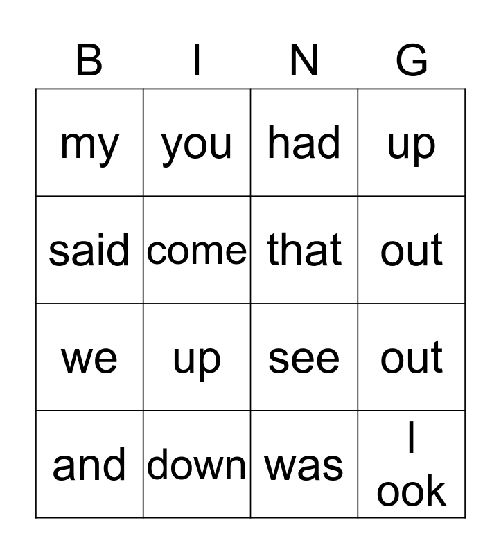 This bingo card has 19 words: see, me, had, l ook, out, said, was, my, you, we, up, come, that, down, and, for, up, out and and.