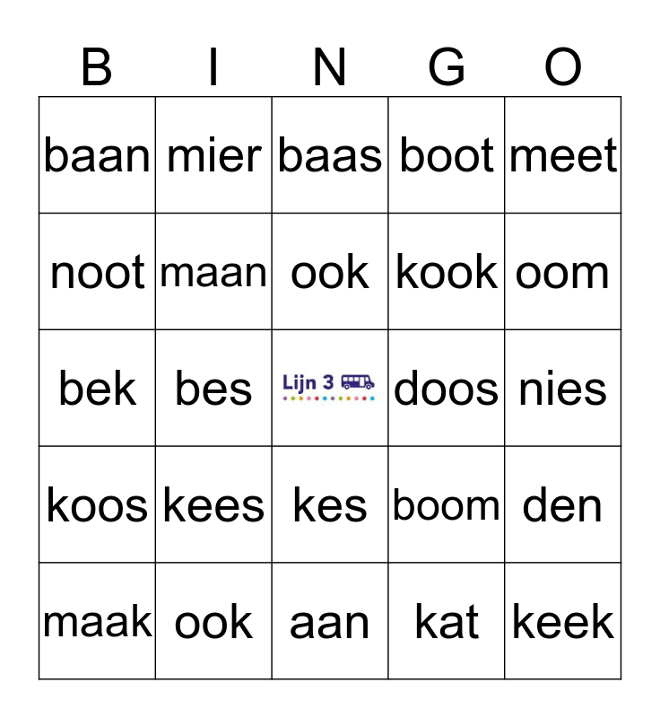 This bingo card has a free space and 70 words: bas, nies, kier, en, ook, toos, boot, is, meet, kaan, den, ben, baan, baas, nik, bes, kes, kook, raak, koos, doos, boom, oom, roos, raak, mes, mik, moos, kat, siem, mier, en, dier, bak, dak, dik, das, riem, sam, noot, net, kees, keek, beek, been, maan, maak, dag, min, rem, naam, kik, ik, ken, aan, in, ook, kaas, ren, rek, bek, noot, beek, tien, kes, tik, biet, riet, nat and beet.