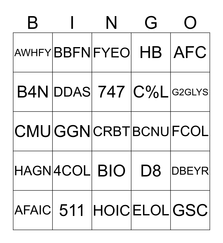 This bingo card has a free space and 24 words: 4COL, 511, 747, AFAIC, AFC, AWHFY, B4N, BBFN, BCNU, BIO, C%L, CMU, D8, DBEYR, DDAS, ELOL, FCOL, FYEO, G2GLYS, GGN, GSC, HAGN, HB and HOIC.