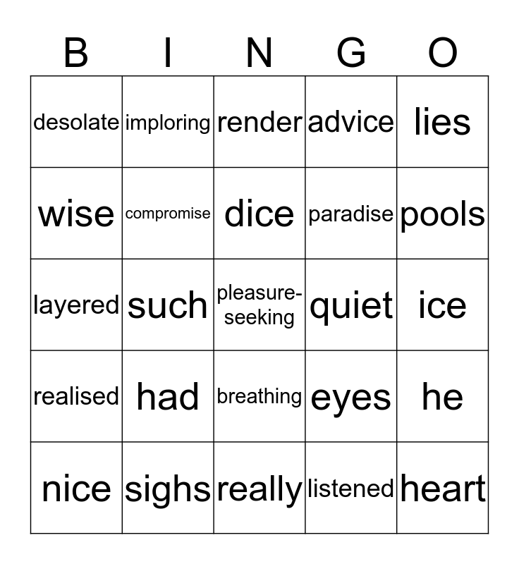 This bingo card has 25 words: had, really, dice, nice, lies, desolate, wise, imploring, quiet, breathing, paradise, layered, eyes, he, compromise, heart, ice, render, pools, such, pleasure-seeking, sighs, realised, advice and listened.