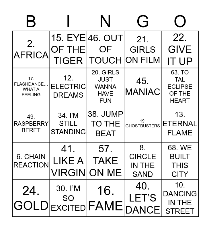 This bingo card has 73 words: Free!, 1. A LITTLE RESPECT, 2. AFRICA, 3. ANGEL EYES, 4. ASHES TO ASHES, 5. CARIBBEAN QUEEN, 6. CHAIN REACTION, 7. CHINA IN YOUR HAND, 8. CIRCLE IN THE SAND, 9. CRITICISE, 10. DANCING IN THE STREET, 11. DANCING ON THE CEILING, 12. ELECTRIC DREAMS, 13. ETERNAL FLAME, 14. EVERYBODY WANTS TO RULE THE WORLD, 15. EYE OF THE TIGER, 16. FAME, 17. FLASHDANCE… WHAT A FEELING, 18. FOOTLOOSE, 19. GHOSTBUSTERS, 20. GIRLS JUST WANNA HAVE FUN, 21. GIRLS ON FILM, 22. GIVE IT UP, 23. GLORIA, 24. GOLD, 25. HOLDING OUT FOR A HERO, 26. HOUSE OF FUN, 27. HOW WILL I KNOW, 28. I WANNA DANCE WITH SOMEBODY, 29. I WANT TO BREAK FREE, 30. I’M SO EXCITED, 31. I’M YOUR MAN, 32. I’VE GOT MY MIND SET ON YOU, 33. I’VE HAD THE TIME OF MY LIFE, 34. I'M STILL STANDING, 35. INTO THE GROOVE, 36. IT MUST BE LOVE, 37. IT’S RAINING MEN, 38. JUMP TO THE BEAT, 39. KARMA CHAMELEON, 40. LET’S DANCE, 41. LIKE A VIRGIN, 42. LIVIN' ON A PRAYER, 43. LOCO IN ACAPULCO, 44. MAN IN THE MIRROR, 45. MANIAC, 46. OUT OF TOUCH, 47. PERFECT, 48. PURPLE RAIN, 49. RASPBERRY BERET, 50. RELAX, 51. RHYTHM OF THE NIGHT, 52. SHE’S LIKE THE WIND, 53. SUMMER OF 69, 54. SUSSUDIO, 55. SWEET DREAMS, 56. TAKE MY BREATH AWAY, 57. TAKE ON ME, 58. TELL IT TO MY HEART, 59. THE ONLY WAY IS UP, 60. THE POWER OF LOVE, 61. THE TIDE IS HIGH, 62. TIME AFTER TIME, 63. TOTAL ECLIPSE OF THE HEART, 64. TRUE, 65. TRUE BLUE, 66. VALERIE, 67. WALK LIKE AN EGYPTIAN, 68. WE BUILT THIS CITY, 69. WEST END GIRLS, 70. WHAT’S LOVE GOT TO DO WITH IT, 71. YOU CAN CALL ME AL and 72. YOU SPIN ME ROUND.