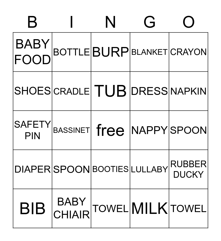 This bingo card has a free space and 29 words: BIB, BOY, BASSINET, GIRL, BABY FOOD, BURP, CRADLE, SPOON, NAPPY, BABY CHIAIR, SPOON, TOWEL, TOWEL, MILK, NAPKIN, SOCKS, BOOTIES, DIAPER, CRAYON, SAFETY PIN, LULLABY, RHYMES, DRESS, SHOES, BLANKET, BOTTLE, RUBBER DUCKY, TUB and PACIFIER.