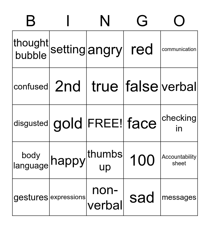 This bingo card has a free space and 24 words: happy, expressions, true, gestures, communication, thought bubble, confused, setting, face, thumbs up, false, disgusted, 100, Accountability sheet, 2nd, sad, checking in, angry, verbal, gold, messages, body language, red and non-verbal.