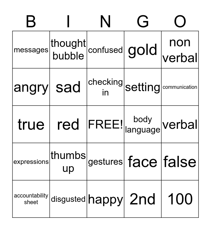 This bingo card has a free space and 24 words: thumbs up, disgusted, checking in, accountability sheet, non verbal, messages, angry, thought bubble, body language, gestures, setting, true, face, false, sad, 2nd, verbal, confused, communication, red, 100, expressions, gold and happy.