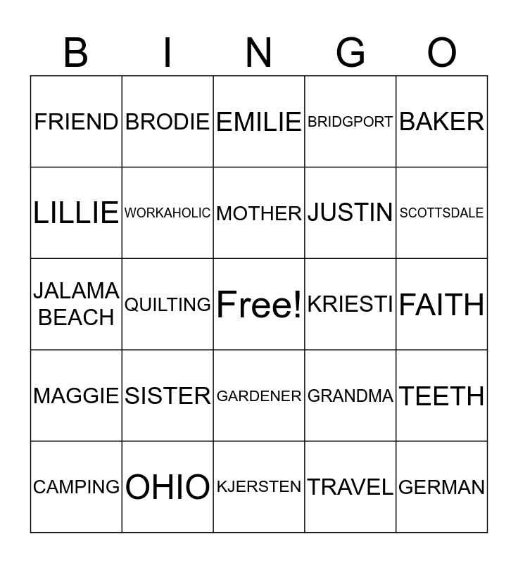 This bingo card has a free space and 27 words: GRANDMA, GRAND KIDS, JUSTIN, KJERSTEN, LILLIE, EMILIE, BRODIE, MAGGIE, KRIESTI, TEETH, JALAMA BEACH, BRIDGPORT, CAMPING, OHIO, SCOTTSDALE, KENNETH, WORKAHOLIC, MOTHER, SISTER, FRIEND, FAITH, TRAVEL, QUILTING, GERMAN, GARDENER, BAKER and IRELAND.