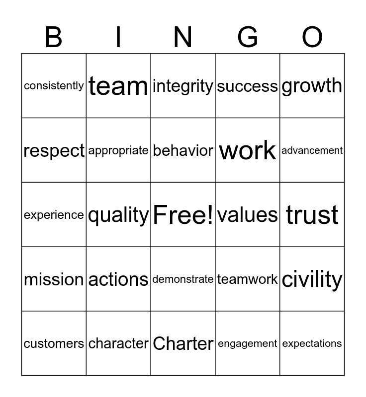 This bingo card has a free space and 28 words: civility, positive, work, engagement, respect, integrity, team, mission, values, customers, experience, success, character, Charter, advancement, contributions, actions, appropriate, behavior, demonstrate, consistently, exceed, expectations, quality, trust, teamwork, growth and learning.