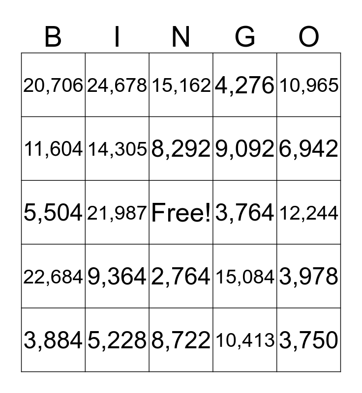 This bingo card has a free space and 24 words: 3,884, 9,364, 8,292, 10,413, 10,965, 20,706, 24,678, 15,162, 3,764, 12,244, 5,504, 14,305, 15,084, 3,978, 11,604, 5,228, 8,722, 4,276, 6,942, 22,684, 21,987, 2,764, 9,092 and 3,750.