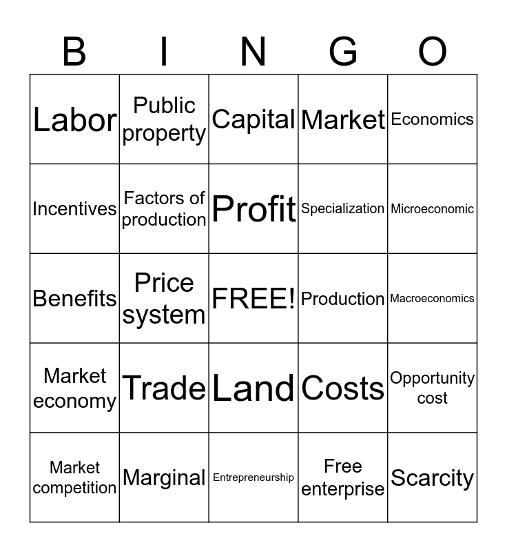 This bingo card has a free space and 24 words: Trade, Marginal, Profit, Market competition, Economics, Labor, Incentives, Public property, Production, Land, Specialization, Benefits, Costs, Opportunity cost, Factors of production, Free enterprise, Macroeconomics, Capital, Microeconomic, Price system, Scarcity, Market economy, Market and Entrepreneurship.