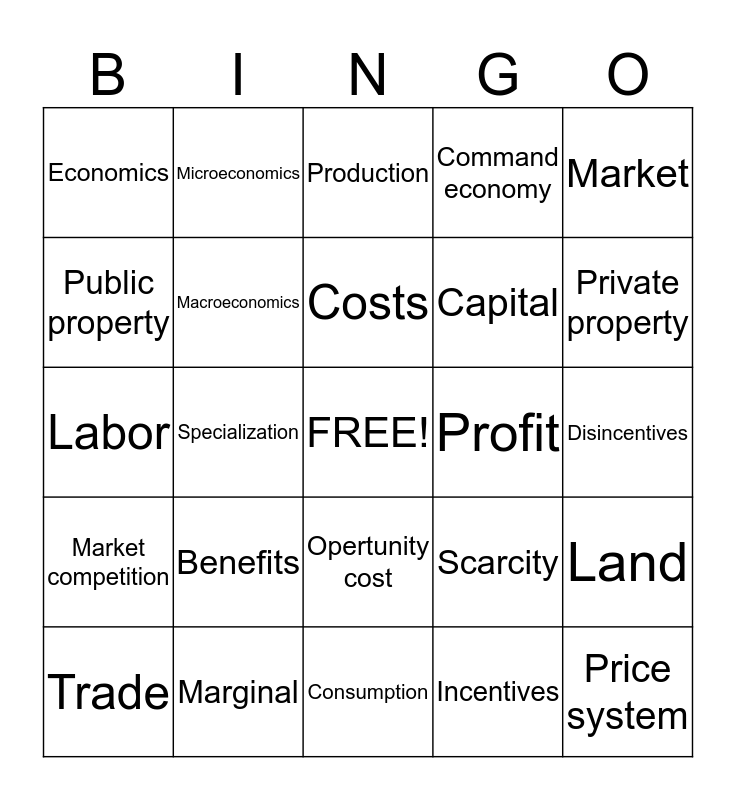 This bingo card has a free space and 24 words: Benefits, Marginal, Costs, Trade, Market, Economics, Public property, Microeconomics, Profit, Opertunity cost, Capital, Labor, Scarcity, Land, Macroeconomics, Incentives, Disincentives, Production, Private property, Specialization, Price system, Market competition, Command economy and Consumption.