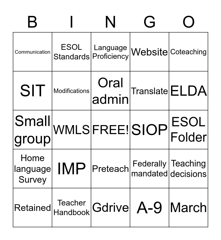 This bingo card has a free space and 24 words: IMP, Teacher Handbook, Oral admin, Retained, Coteaching, Communication, SIT, ESOL Standards, SIOP, Preteach, Translate, Small group, Federally mandated, Teaching decisions, Modifications, A-9, ESOL Folder, Language Proficiency, ELDA, WMLS, March, Home language Survey, Website and Gdrive.
