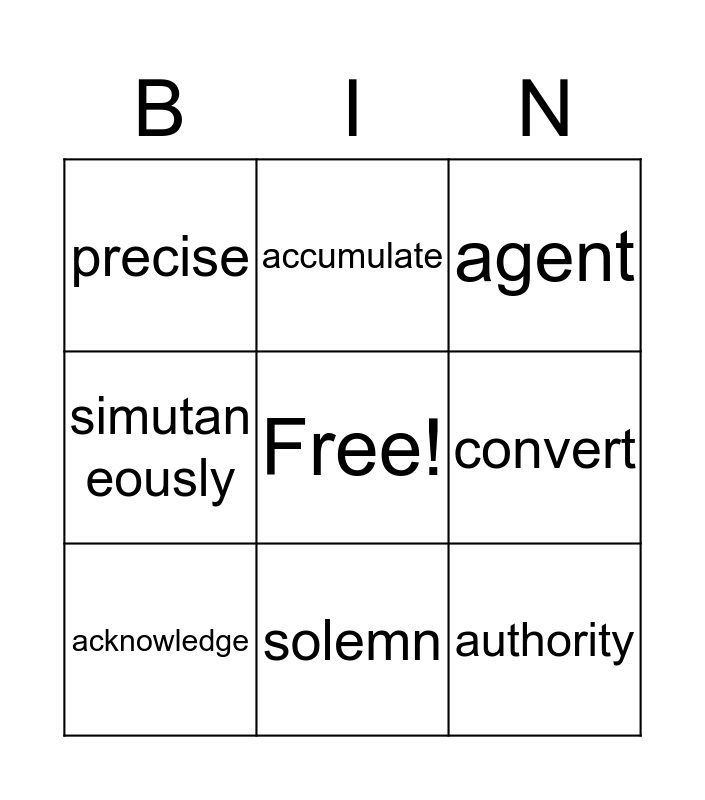 This bingo card has a free space and 8 words: convert, agent, accumulate, acknowledge, precise, authority, simutan eously and solemn.