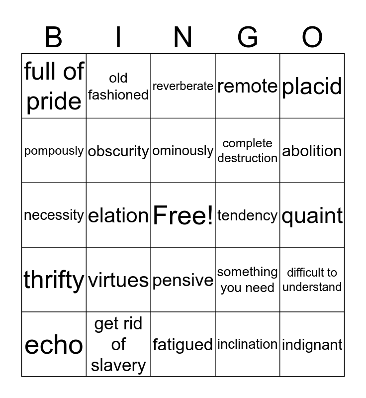 This bingo card has a free space and 24 words: virtues, get rid of slavery, ominously, echo, placid, full of pride, pompously, old fashioned, tendency, pensive, complete destruction, necessity, something you need, difficult to understand, obscurity, inclination, quaint, reverberate, abolition, elation, indignant, thrifty, remote and fatigued.