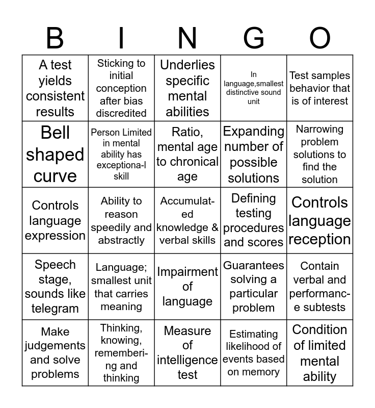 This bingo card has a free space and 24 words: Make judgements and solve problems, Language; smallest unit that carries meaning, Ratio, mental age to chronical age, Estimating likelihood of events based on memory, Test samples behavior that is of interest, A test yields consistent results, Sticking to initial conception after bias discredited, Underlies specific mental abilities, Defining testing procedures and scores, Controls language reception, Controls language expression, Person Limited in mental ability has exceptiona-l skill, Guarantees solving a particular problem, Contain verbal and performanc-e subtests, Bell shaped curve, Thinking, knowing, rememberi-ng and thinking, Measure of intelligence test, In language,smallest distinctive sound unit, Narrowing problem solutions to find the solution, Speech stage, sounds like telegram, Ability to reason speedily and abstractly, Impairment of language, Expanding number of possible solutions and Condition of limited mental ability.