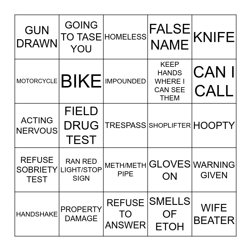 This bingo card has a free space and 24 words: HANDSHAKE, RAN RED LIGHT/STOP SIGN, IMPOUNDED, SMELLS OF ETOH, KNIFE, GUN DRAWN, GOING TO TASE YOU, HOMELESS, SHOPLIFTER, HOOPTY, ACTING NERVOUS, BIKE, GLOVES ON, WARNING GIVEN, MOTORCYCLE, PROPERTY DAMAGE, REFUSE TO ANSWER, FALSE NAME, CAN I CALL, REFUSE SOBRIETY TEST, FIELD DRUG TEST, METH/METH PIPE, KEEP HANDS WHERE I CAN SEE THEM and WIFE BEATER.