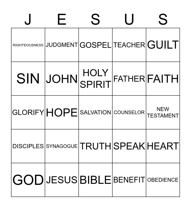 This bingo card has a free space and 24 words: SYNAGOGUE, JESUS, HOLY SPIRIT, GOD, GUILT, RIGHTEOUSNESS, SIN, JUDGMENT, COUNSELOR, TRUTH, FATHER, GLORIFY, SPEAK, HEART, JOHN, BENEFIT, NEW TESTAMENT, GOSPEL, FAITH, HOPE, OBEDIENCE, DISCIPLES, TEACHER and BIBLE.