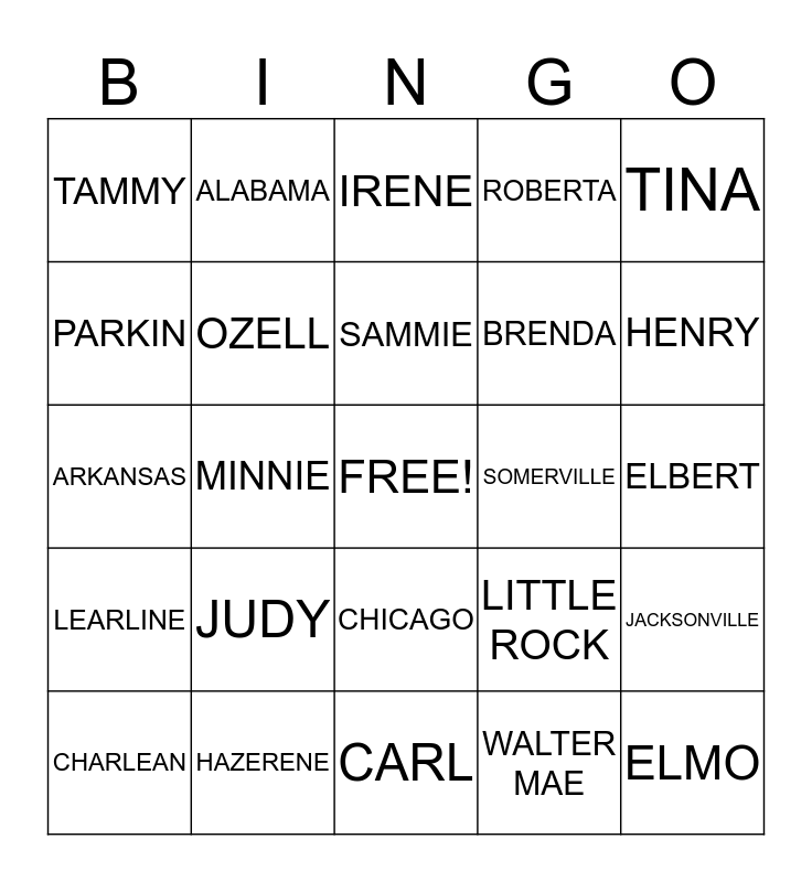This bingo card has a free space and 24 words: JUDY, HAZERENE, SAMMIE, CHARLEAN, TINA, TAMMY, PARKIN, ALABAMA, SOMERVILLE, CHICAGO, BRENDA, ARKANSAS, LITTLE ROCK, JACKSONVILLE, OZELL, WALTER MAE, ELBERT, IRENE, HENRY, MINNIE, ELMO, LEARLINE, ROBERTA and CARL.
