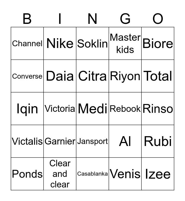 This bingo card has a free space and 24 words: Garnier, Clear and clear, Citra, Ponds, Biore, Channel, Converse, Nike, Rebook, Jansport, Riyon, Iqin, Al, Rubi, Daia, Venis, Rinso, Soklin, Total, Victoria, Izee, Victalis, Master kids and Casablanka.