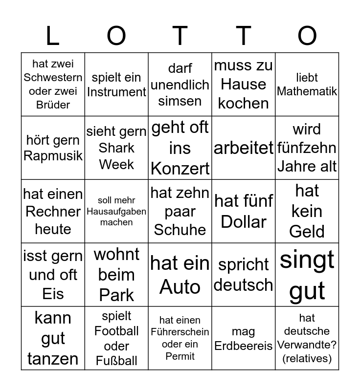 This bingo card has 25 words: wohnt beim Park, hat einen Führerschein oder ein Permit, geht oft ins Konzert, kann gut tanzen, liebt Mathematik, hat zwei Schwestern oder zwei Brüder, hört gern Rapmusik, spielt ein Instrument, hat fünf Dollar, hat ein Auto, arbeitet, hat einen Rechner heute, spricht deutsch, singt gut, sieht gern Shark Week, hat deutsche Verwandte? (relatives), hat kein Geld, darf unendlich simsen, wird fünfzehn Jahre alt, soll mehr Hausaufgaben machen, hat zehn paar Schuhe, spielt Football oder Fußball, isst gern und oft Eis, muss zu Hause kochen and mag Erdbeereis.