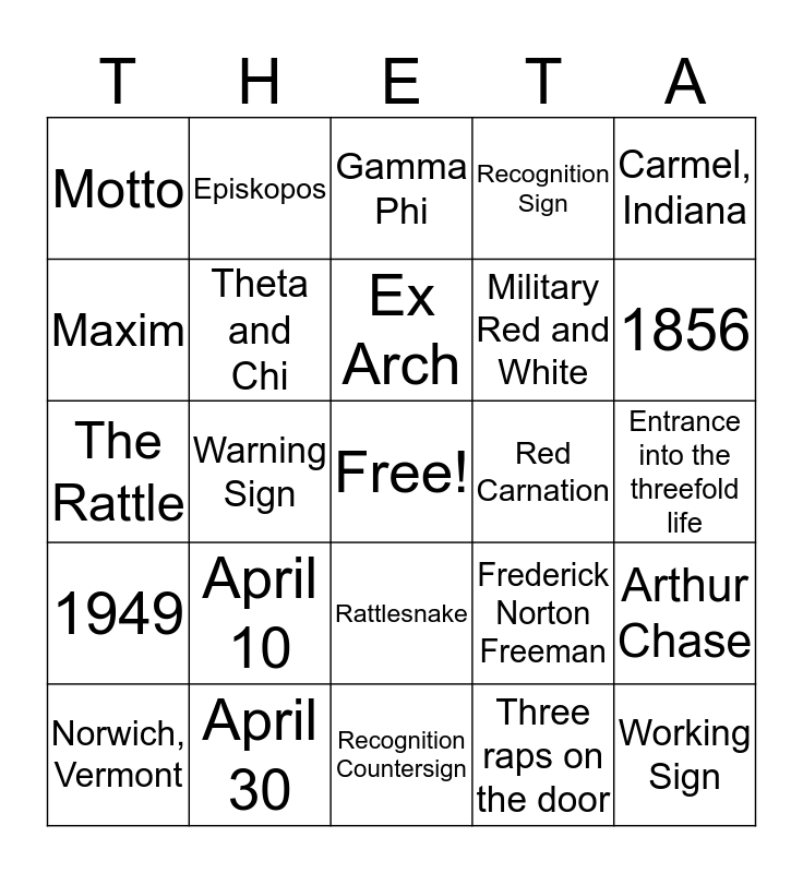This bingo card has a free space and 24 words: April 10, April 30, Ex Arch, Norwich, Vermont, Carmel, Indiana, Motto, Maxim, Episkopos, Red Carnation, Rattlesnake, Military Red and White, The Rattle, Frederick Norton Freeman, Arthur Chase, Theta and Chi, Three raps on the door, Entrance into the threefold life, Gamma Phi, 1856, Warning Sign, Working Sign, 1949, Recognition Sign and Recognition Countersign.