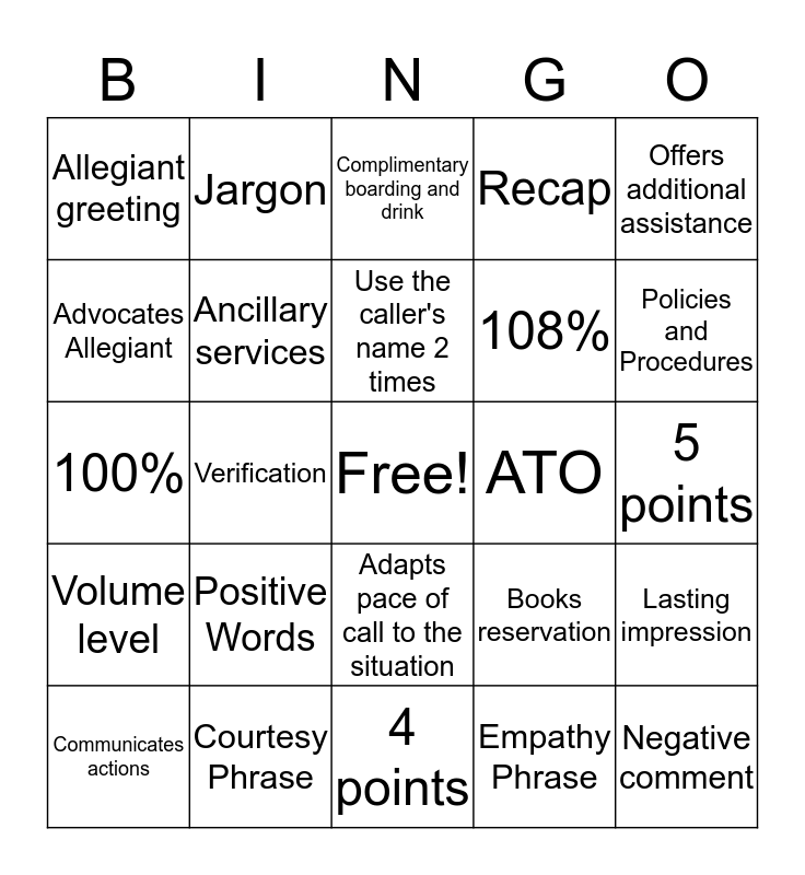 This bingo card has a free space and 24 words: Communicates actions, Positive Words, Use the caller's name 2 times, Empathy Phrase, Offers additional assistance, Allegiant greeting, Jargon, Complimentary boarding and drink, ATO, 5 points, 100%, Ancillary services, Books reservation, Lasting impression, Advocates Allegiant, Courtesy Phrase, 4 points, Recap, Policies and Procedures, Volume level, Verification, Adapts pace of call to the situation, 108% and Negative comment.