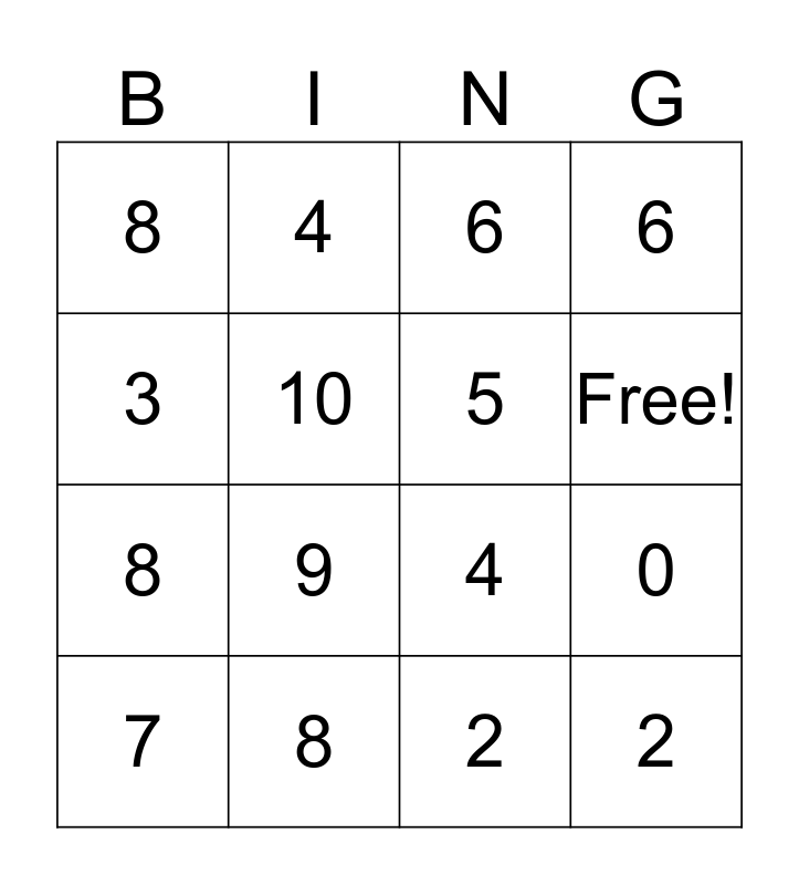 This bingo card has 18 words: 9, 2, 6, 8, 4, 6, 7, 4, Free!, 8, 2, 3, 0, 10, 5, 1, 8 and 2.