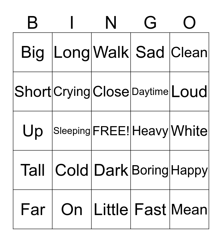 This bingo card has a free space and 24 words: Cold, On, Close, Far, Clean, Big, Short, Long, Heavy, Dark, Daytime, Up, Boring, Happy, Crying, Fast, White, Walk, Loud, Sleeping, Mean, Tall, Sad and Little.