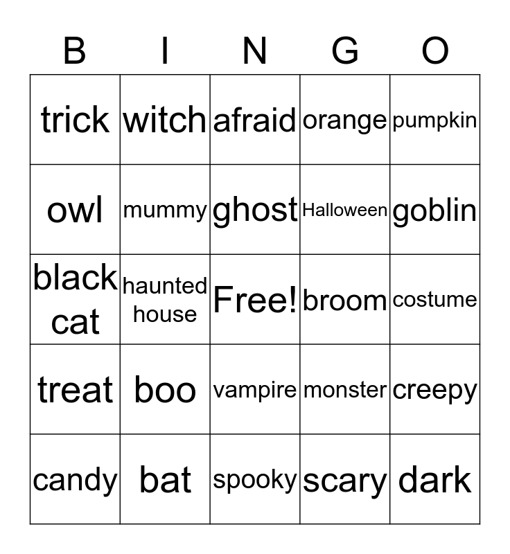 This bingo card has a free space and 24 words: boo, bat, ghost, candy, pumpkin, trick, owl, witch, broom, vampire, Halloween, black cat, monster, creepy, mummy, scary, costume, afraid, goblin, haunted house, dark, treat, orange and spooky.
