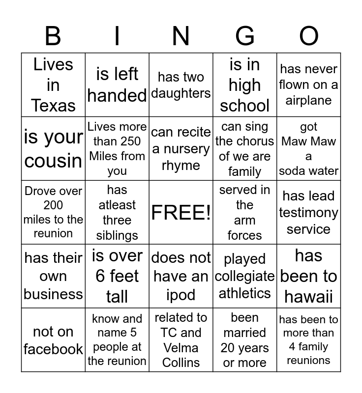 This bingo card has a free space and 24 words: is over 6 feet tall, know and name 5 people at the reunion, can recite a nursery rhyme, not on facebook, has never flown on a airplane, Lives in Texas, is your cousin, is left handed, served in the arm forces, does not have an ipod, can sing the chorus of we are family, Drove over 200 miles to the reunion, played collegiate athletics, has been to hawaii, Lives more than 250 Miles from you, been married 20 years or more, has lead testimony service, has two daughters, got Maw Maw a soda water, has atleast three siblings, has been to more than 4 family reunions, has their own business, is in high school and related to TC and Velma Collins.